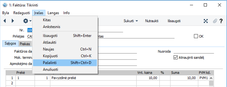 Nepatvirtintą faktūrą (OK varnelė nepažymėta) galima pašalinti atidarius meniu "Įrašas" iš lango įrankių juostos bei pasirinkus "Pašalinti" arba naudoti klaviatūros mygtukų kombinaciją Ctrl+Shift+D (žr. pav. 1).