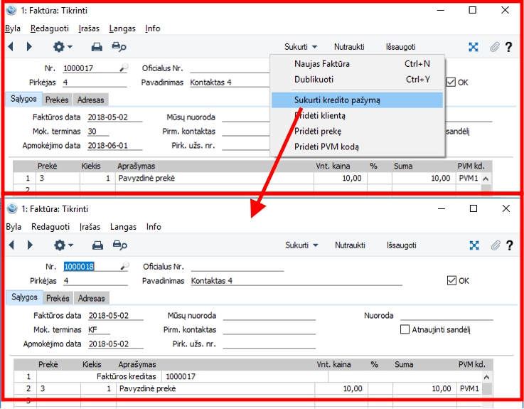 4.2. Sistema sukurs naują faktūros įrašą su mokėjimo terminu "KF" (ar jūsų nustatytu kredito faktūros terminu).