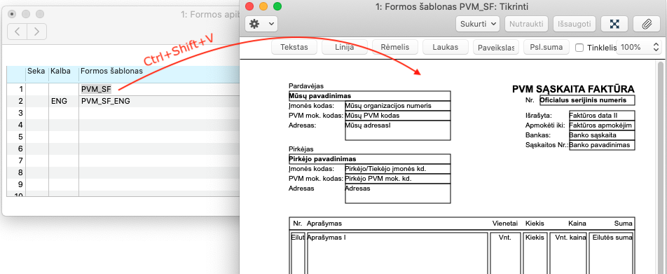 Pirmuoju atveju jums reikia pažymėti norimą formos kodą ir paspausti Ctrl+Shift+V mygtukų kombinaciją (naudojant Mac - Cmd+Shift+V).